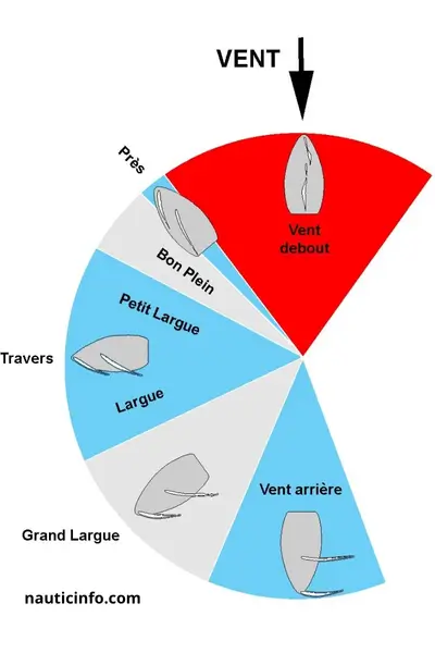 - Une zone conique en haut (face au vent) : Colorée en rouge et légendée « Zone de Faseyement » ou « Vent Debout » (environ 45° de chaque côté de l’axe du vent). Dans cette zone, le voilier ne peut avancer, ses voiles battent comme un drapeau.